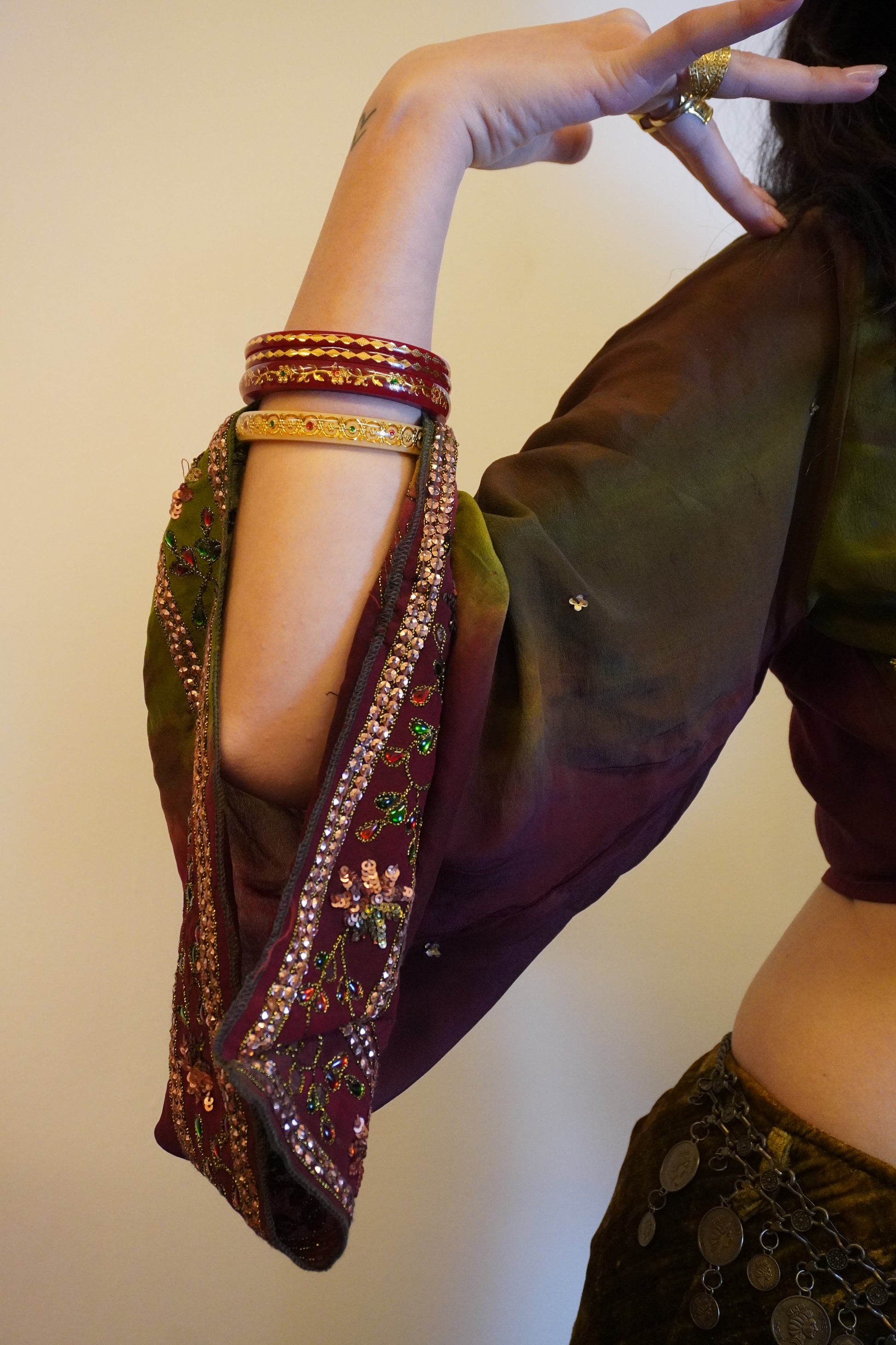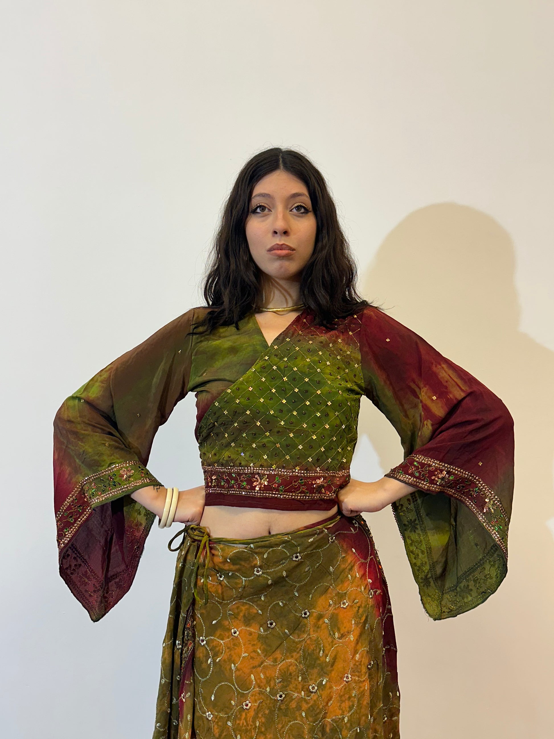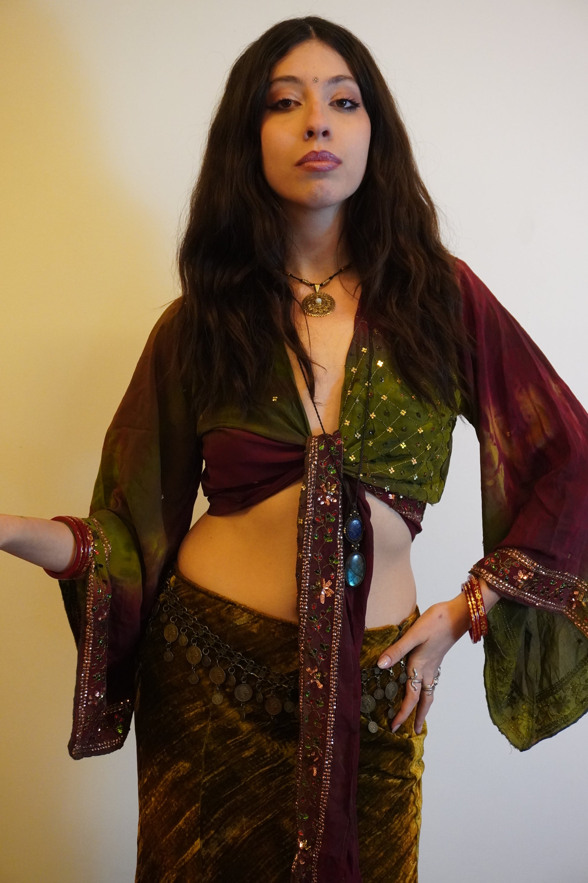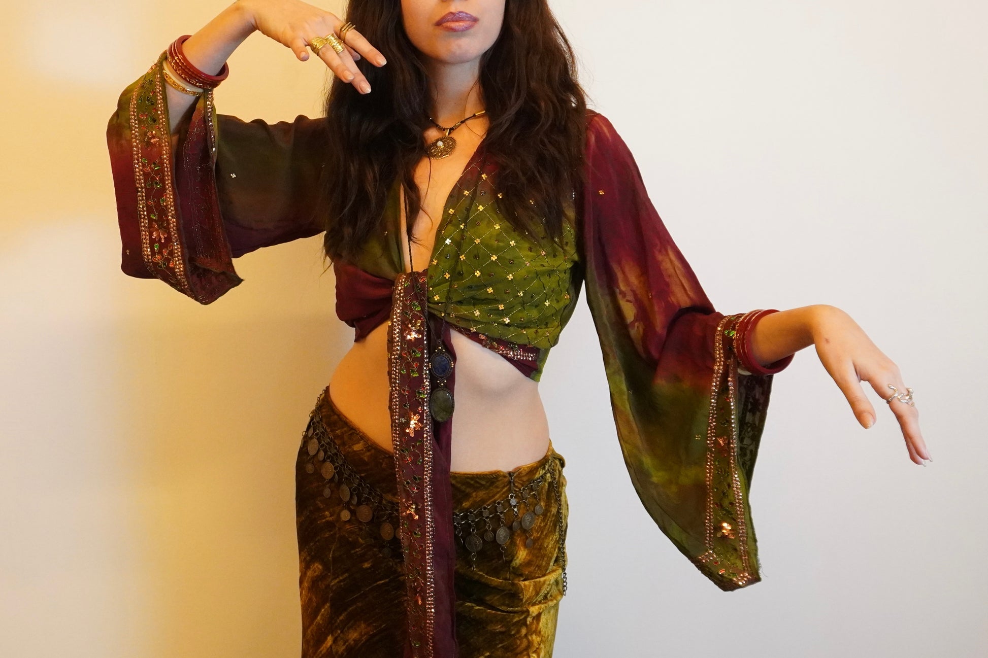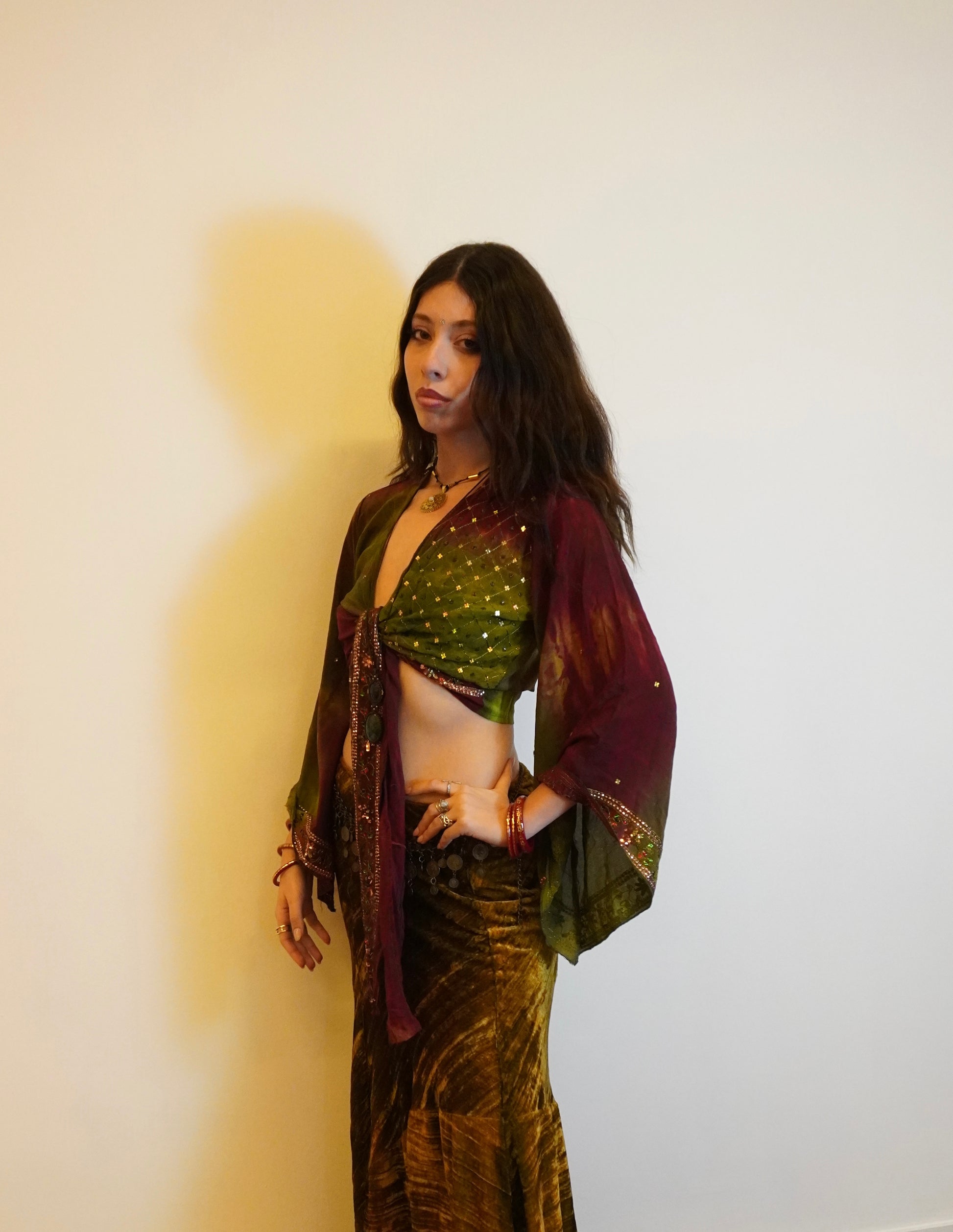 Realizzato in pregiata seta indiana, questo bolerino offre una lucentezza naturale che cattura la luce, esaltando ogni movimento. La tecnica tie-dye, tradizionale dell'India, conferisce al capo un motivo unico e sfumato, dove i colori si fondono in un gioco armonioso di tonalità.