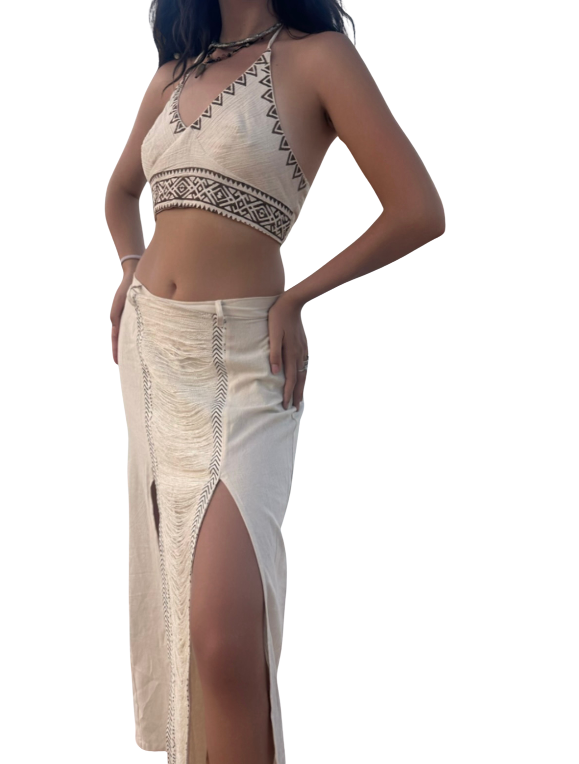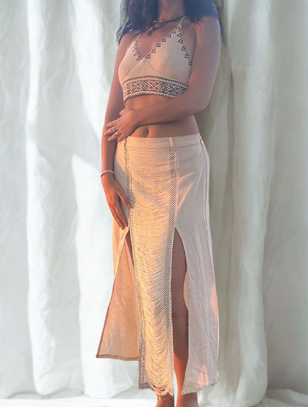 Gonna in cotone con doppio spacco e frange sul davanti, decorazioni tribali