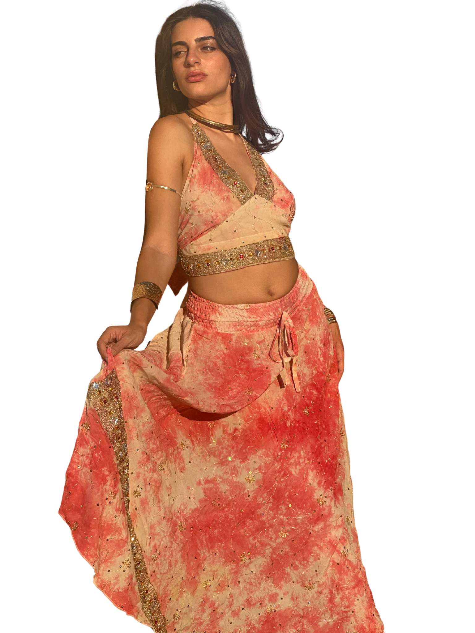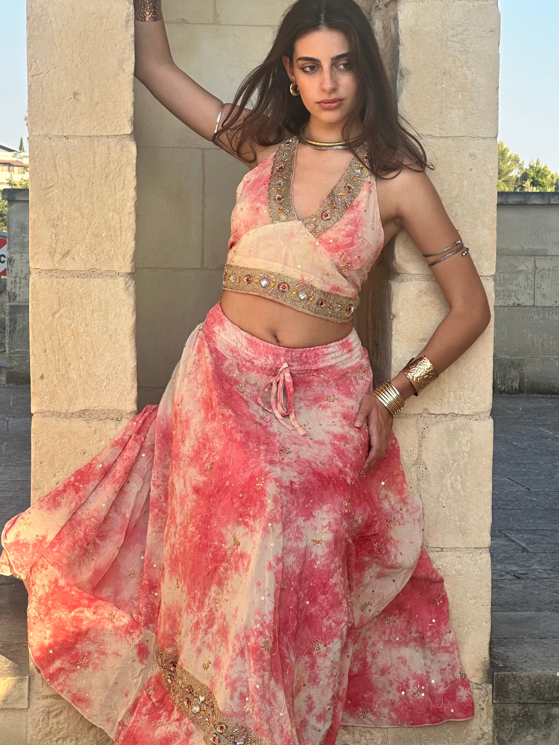Set coordinato rosa e bianco tie-dye con ricami a mano