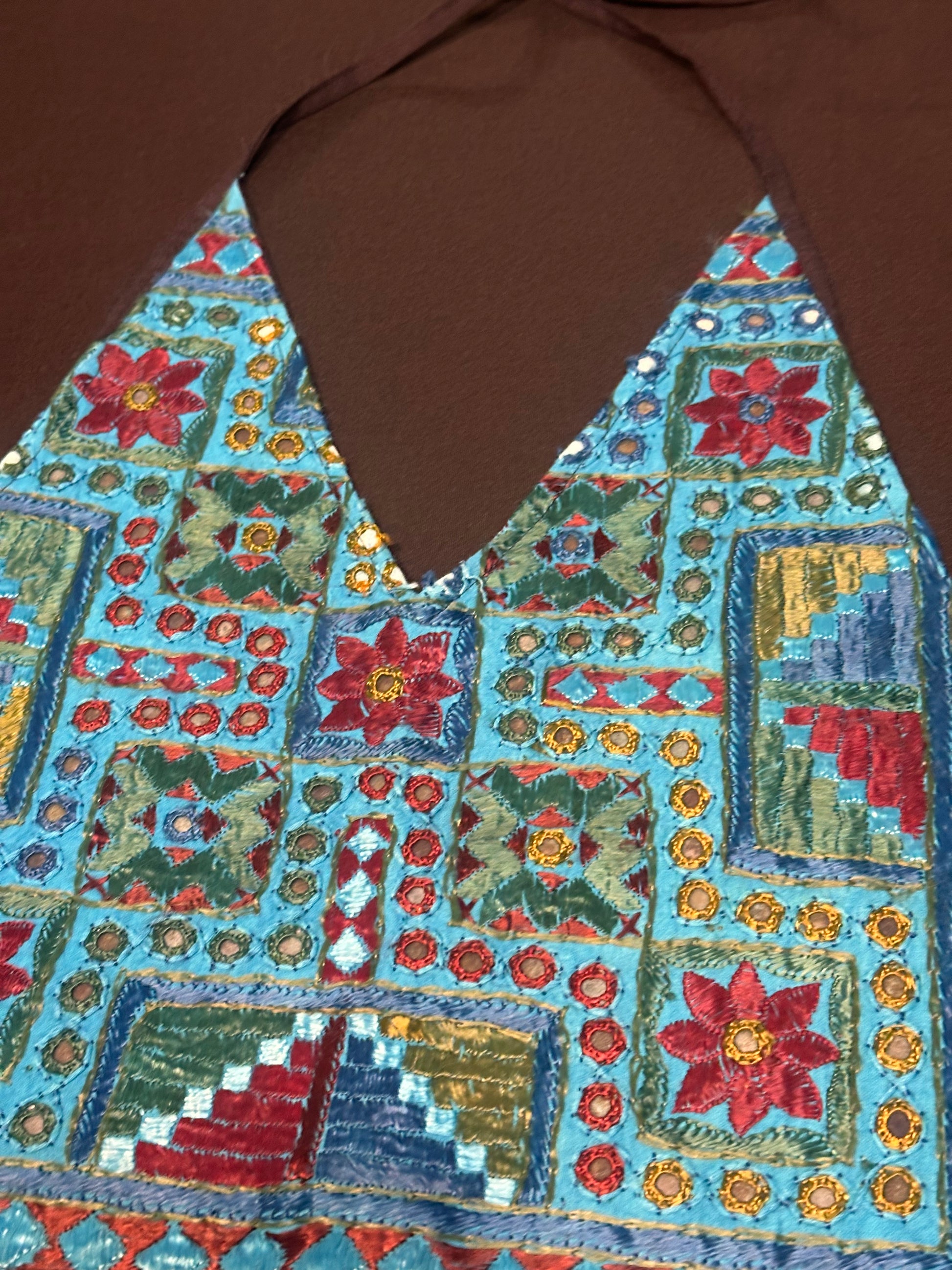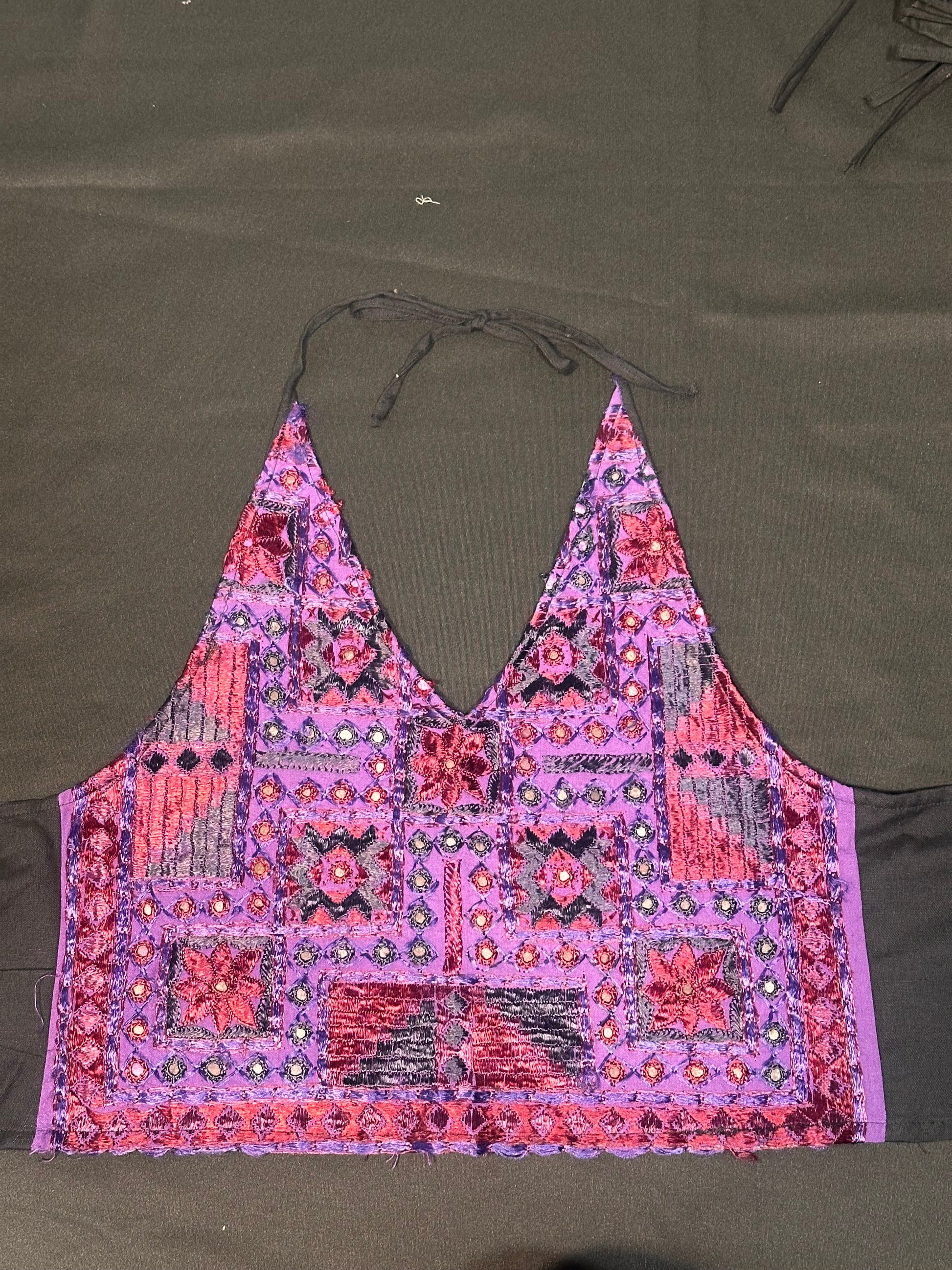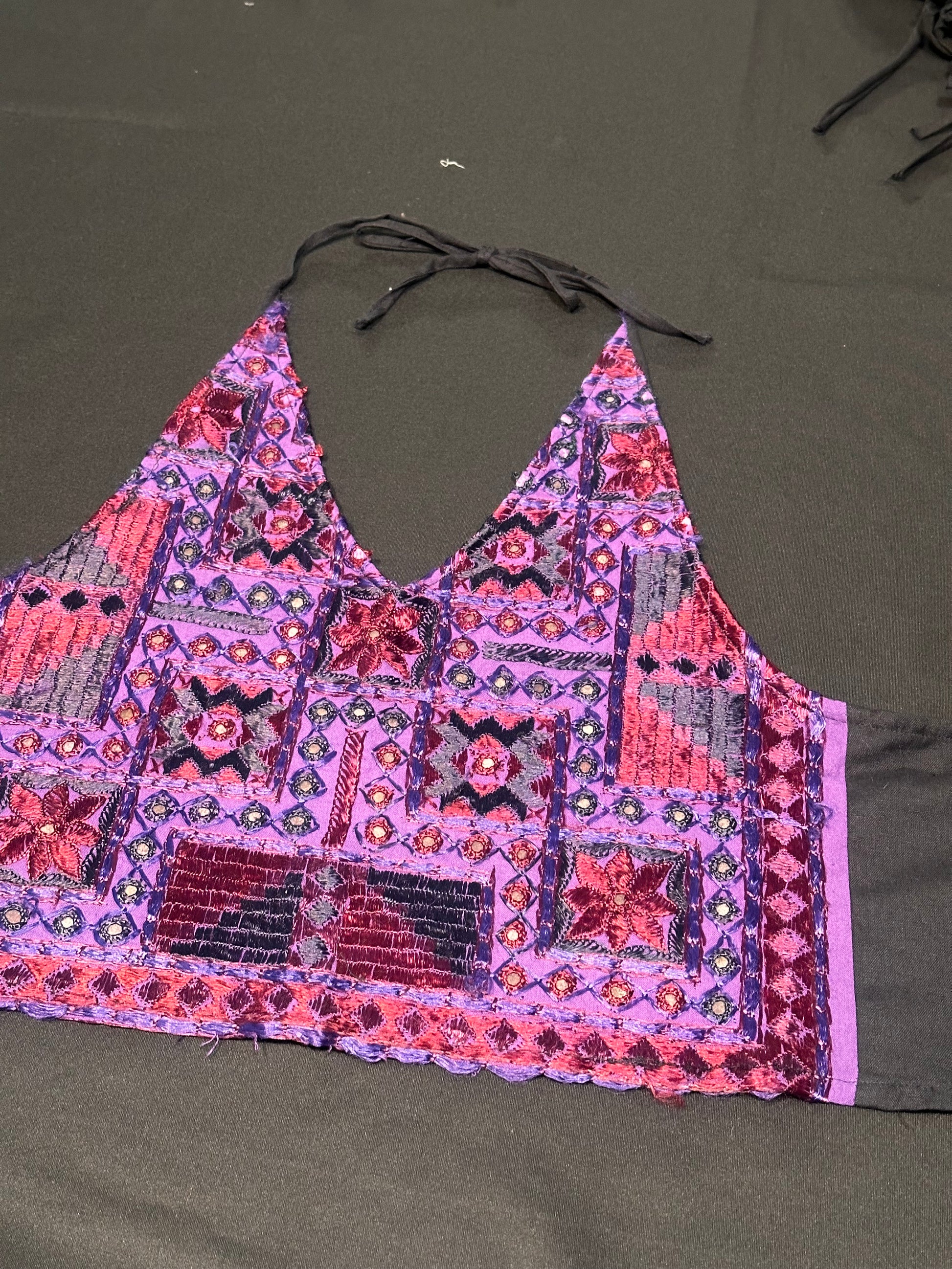 Top a triangolo ispirato all’antica arte tessile del Gujarat, questo top racchiude tutta la forza espressiva del ricamo Kutch: un mosaico di colori vibranti e piccoli specchi Abhala (shisha) che catturano la luce a ogni movimento.